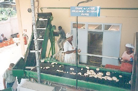 Die geschälten Früchte werden von der Förderschnecke